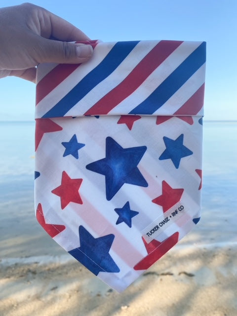 Always + Forever an Army Brat, Tucker and I are thrilled to bring you our own version of the Stars + Stripes. This reversible option is perfect for that Pawtriotic Pup in your life. The reversible option also gives you so many ways to wear your Stars + Stripes!